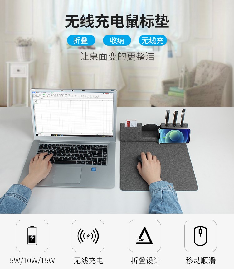 折疊支架款無線充電鼠標墊可定制 布紋超薄無線充鼠標墊可印LOGO